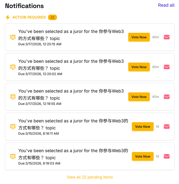 Smarter notifications. A new “Action Required” section sits at the top of your notifications page, surfacing items that need your attention — jury duty, judge assignments, claimable bounties, and more — with direct CTA buttons. Notifications also auto-mark as read when you click any link inside them.