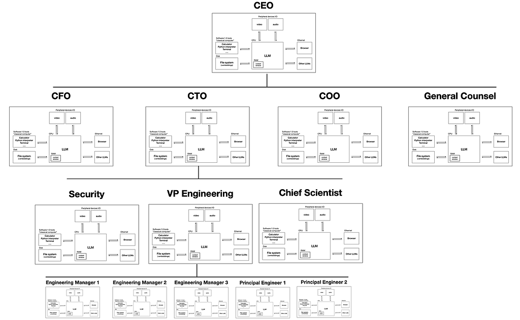 Andrej Karpathy 用两张图预言:大型语言模型(LLM)正从“工具”变成“新计算机”,未来最强AI系统像一家公司——CEO级LLM统领CFO、CTO等多层智能体,每个都有工具、内存和分工,人类只定目标,剩下交给“Agent公司”自主运行。
