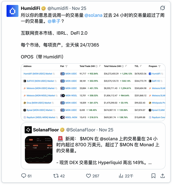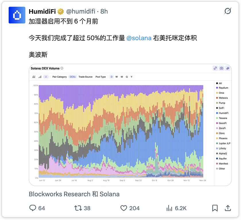 HumidiFi 是 Solana 平台上交易量最大的去中心化交易所 (DEX),日交易量超过 10 亿美元,约占所有现货 DEX 交易量的 35%。与传统的自动做市商 (AMM) 不同,HumidiFi 是一款新一代“专有 AMM”(prop AMM),它将链上执行与机构级做市逻辑相结合。其结果是:更低的价差、更深的流动性以及优于 DEX 和 CEX 竞争对手的执行性能。