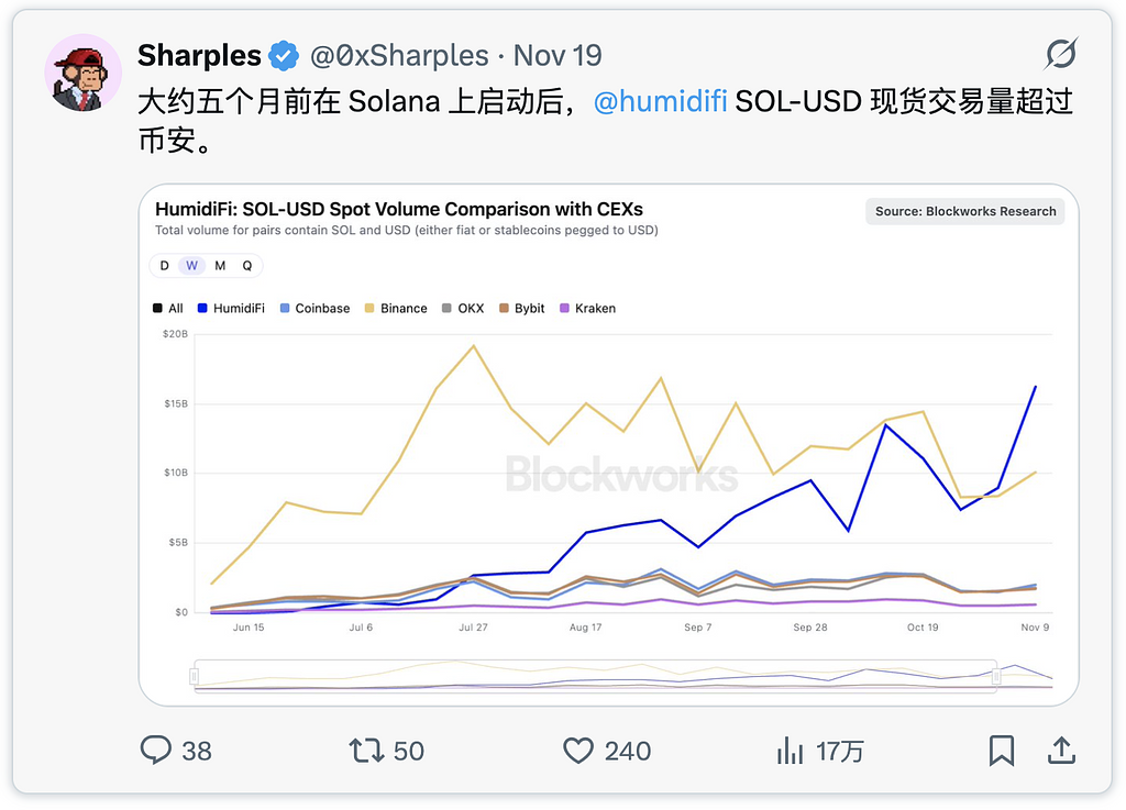 HumidiFi 是 Solana 平台上交易量最大的去中心化交易所 (DEX),日交易量超过 10 亿美元,约占所有现货 DEX 交易量的 35%。它将链上执行与机构级做市逻辑相结合。其结果是:更低的价差、更深的流动性以及优于 DEX 和 CEX 竞争对手的执行性能。