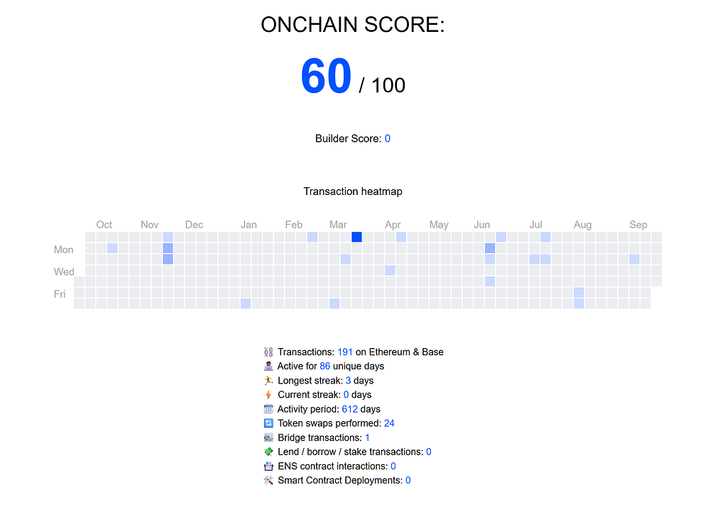 • 冲击: 这是一个核心指标,占分数的最大部分。例如,一个在 Base 上拥有 300 个交易(交换、转账)的钱包可以达到 ~70/100 的该指标。