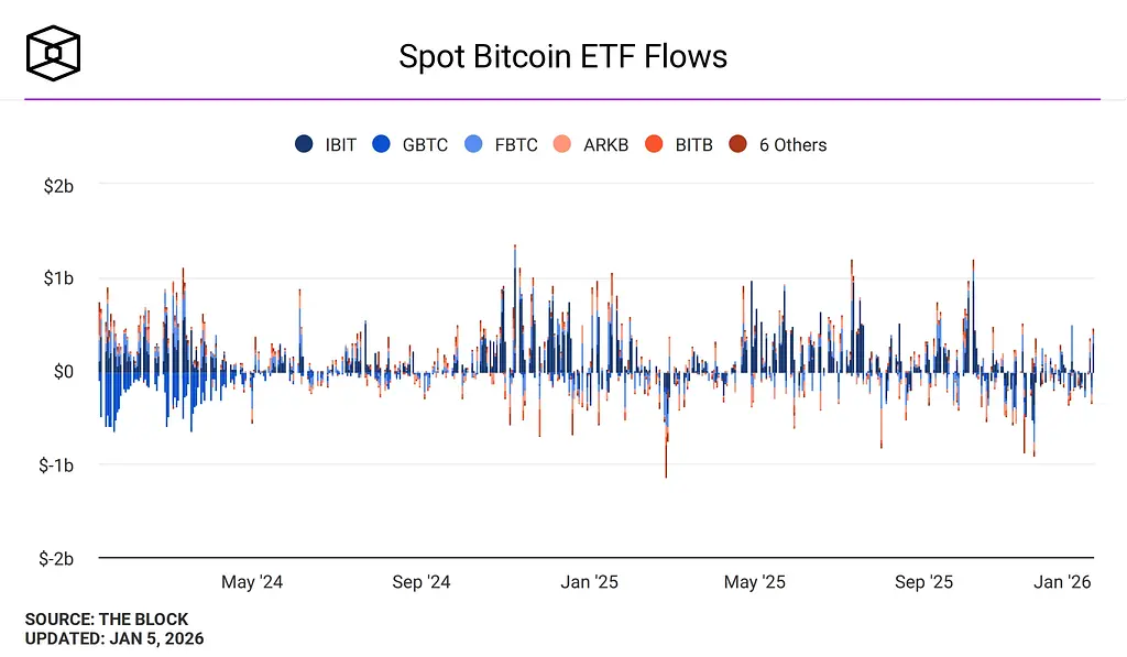 数据支撑这一观点:尽管2025年末ETF流出潮导致比特币价格回调20%,但2026年开局强劲,1月2日单日流入4.71亿美元,黑石IBIT领衔2.87亿美元。 这反映机构兴趣从投机转向配置。展望全年,比特币可能与黄金更趋同步,而非高beta科技股。机会在于:结构性需求如ETF和企业囤积(MicroStrategy式),将缓冲下行风险。
