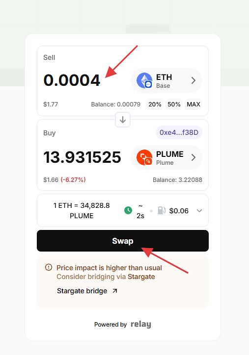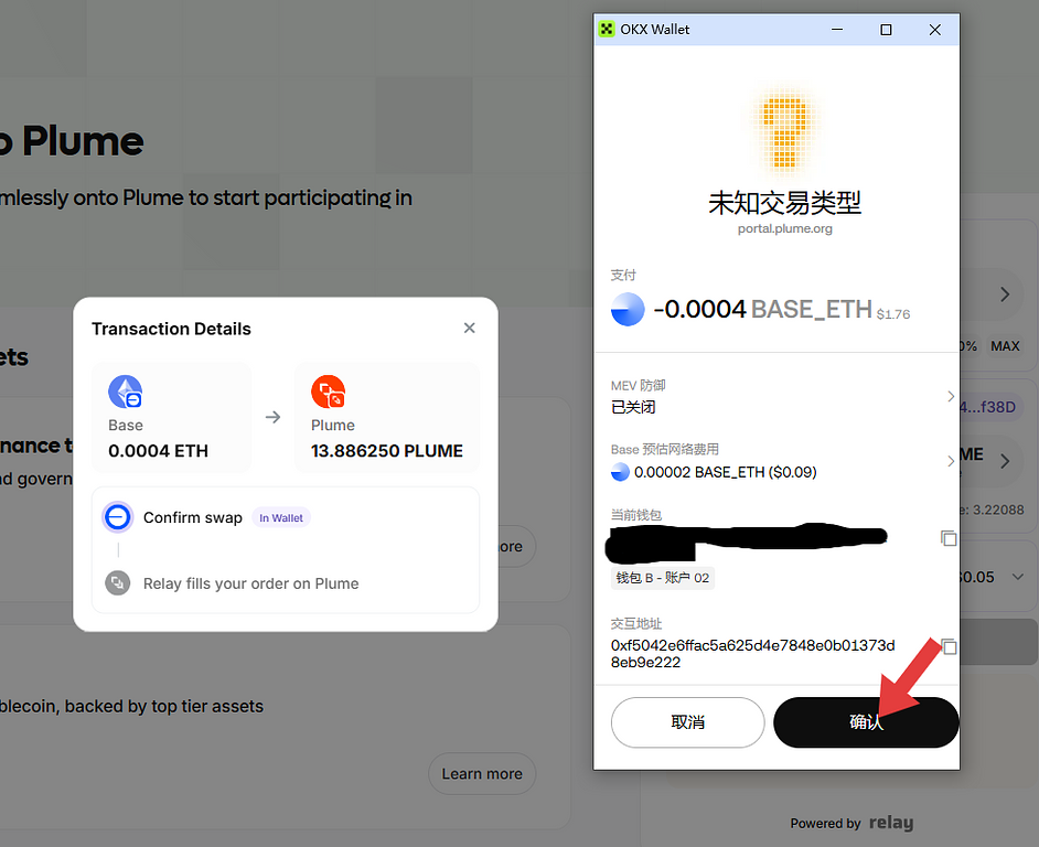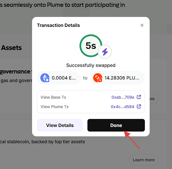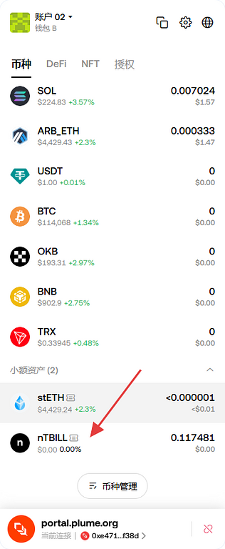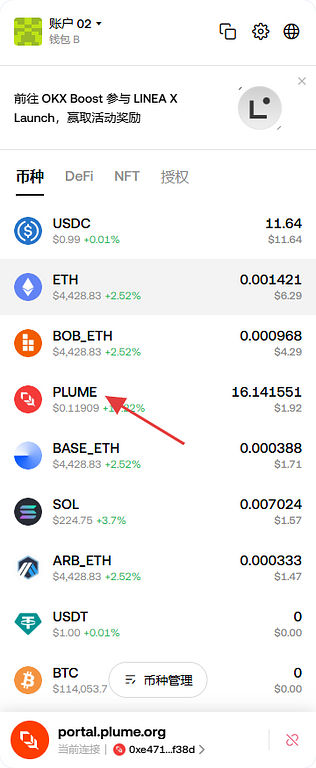 在钱包中确认我们的PLUME已到账,这部做完相当于把base的ETH即跨链又兑换成PLUME。
