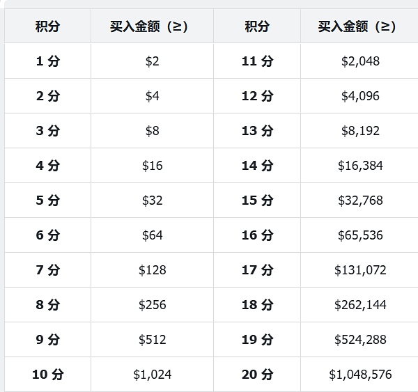 - 交易量积分 (刷分的核心) 这部分积分是你通过主动交易获得的,也是积分的主要来源。需要注意的是,只有“买入”Alpha代币的交易量才会计入积分,“卖出”不计分。其计算方式遵循2的n次方模式: