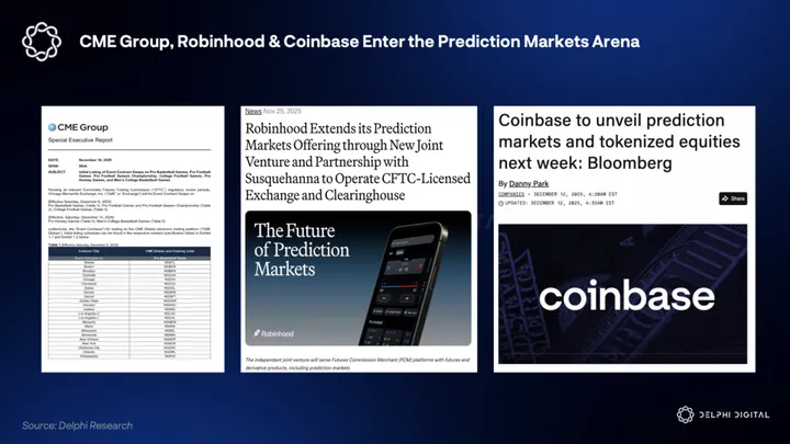 Kalshi 2025 年收入预计超过 6 亿美元,Robinhood 通过 Kalshi 的预测市场业务线已经贡献超过 1 亿美元收入。CME 计划上线体育预测市场,Coinbase 正式入场,Robinhood 收购 MIAXdx 以构建内部市场,Polymarket 与 Kalshi 也开始直接争夺彼此地盘。