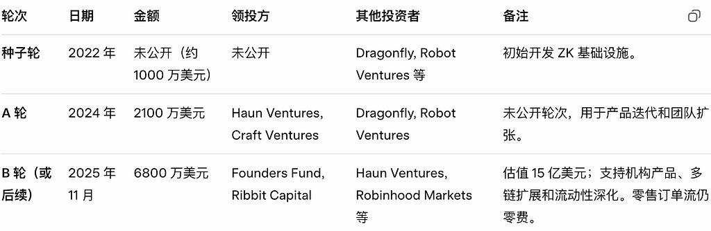 Lighter 已完成多轮融资,总额超过 1 亿美元,估值达 15 亿美元(post-money)。融资聚焦于扩展机构服务、低延迟基础设施和公开发布。最新一轮为股权 + 代币权证(token warrants),支持即将到来的代币生成事件(TGE)。
