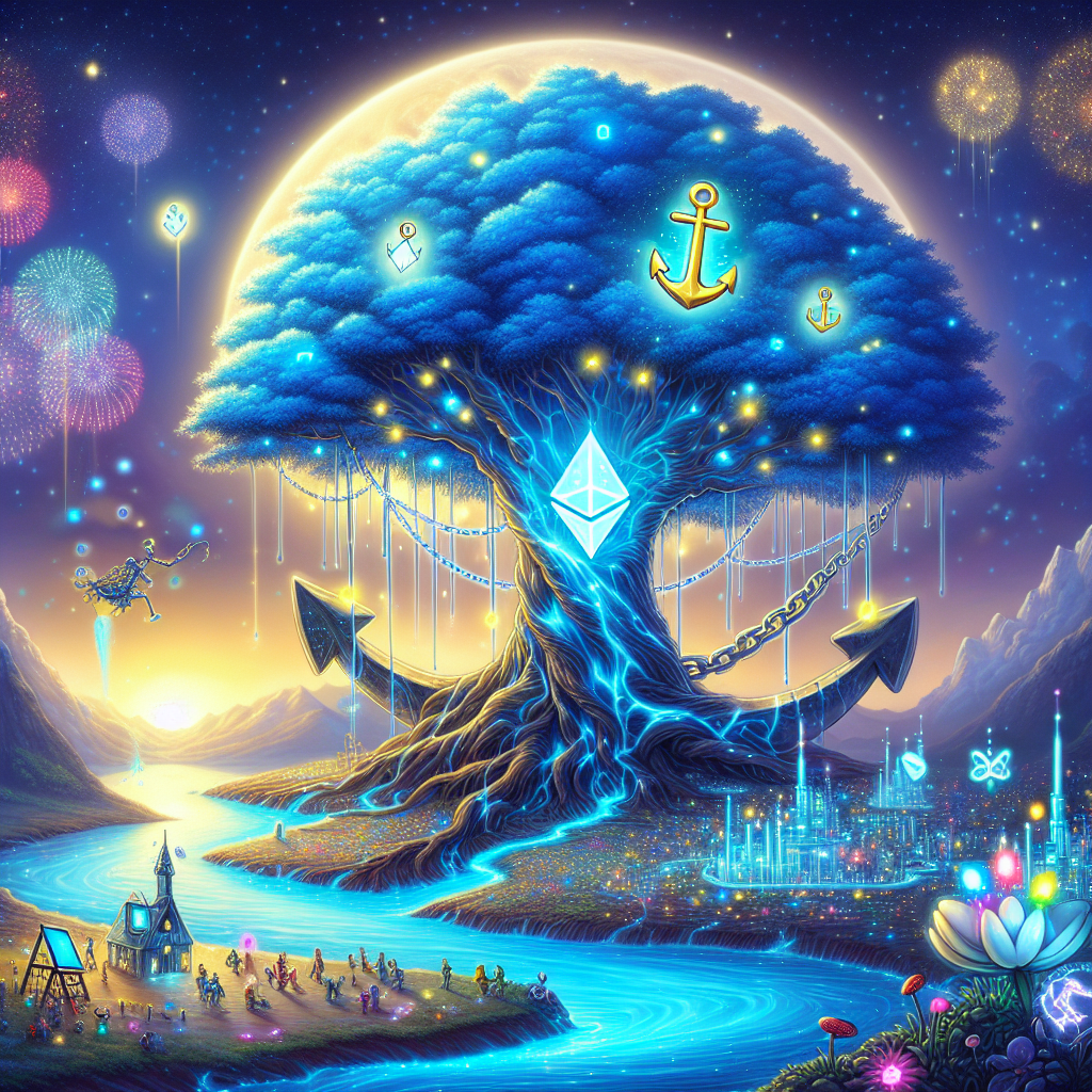 2. 生命之树(ETH):从金锚上生长出来的这棵巨大的、发光的蓝色神树,就是ETH。它是生态的中心,承载着所有的繁荣。树干粗壮,枝繁叶茂,它是这个世界的“操作系统”。