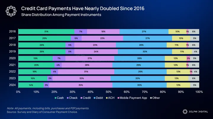 几十年来,这些特性转化为无处不在的便利,这些网络也成为商业的默认基础设施。以至于信用卡网络在现有传统支付工具中的市场份额几乎翻了一番。