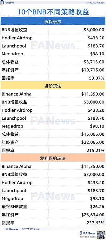 收益: 按照2025年BNB的平均价格计算,手中的10枚BNB,到年底将变成约26.26枚。以年底约900美元价格计算,资产总额将来到23634美元,年化回报率达到237%。