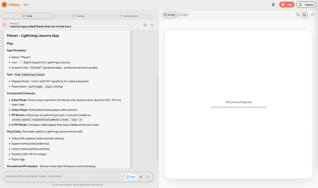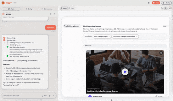 首先,我会去 Chippy.build,请 Chippy 帮我规划这个项目。Chippy 建议使用一种叫 find_lightning_lesson 的工具,它能接收一个主题作为输入。然后它会显示一张内联卡作为起始,并有切换为画中画的选项。