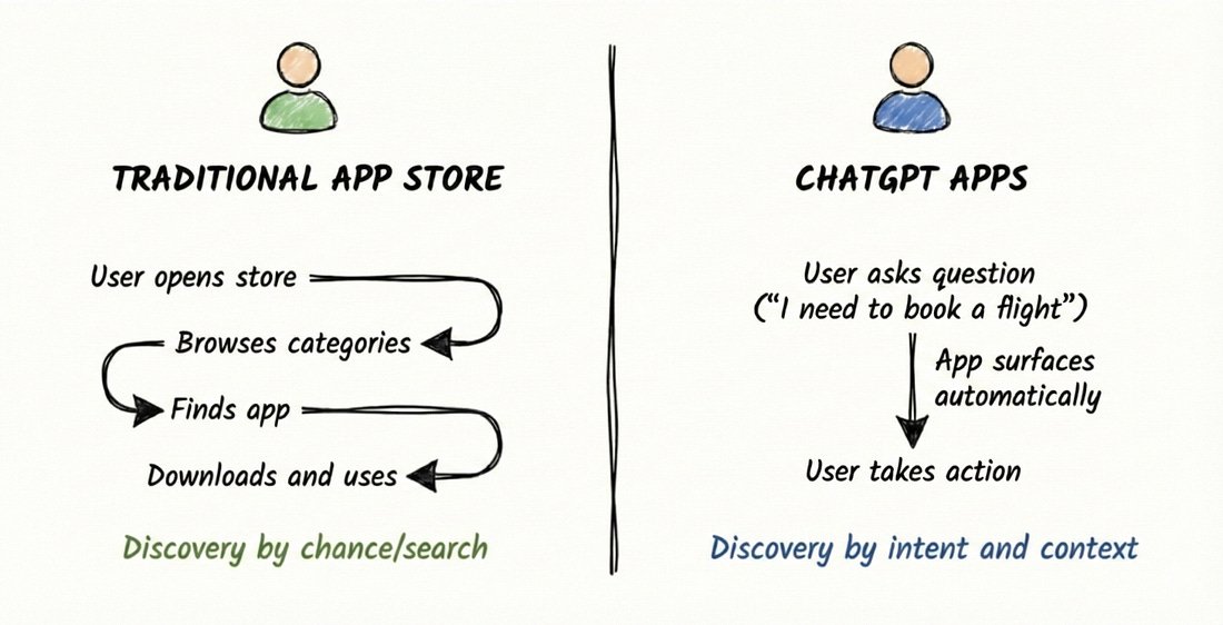 ChatGPT 应用引入了与传统应用商店不同的交互模式。在大多数应用商店,你必须找到应用,安装它,只有之后才能使用。ChatGPT 支持这种模式,但更有趣的模式是上下文浮现。在不久的将来(而且大多数人还没完全理解这一点),ChatGPT 会根据用户的对话自动推荐应用 。询问旅行计划时,Expedia 就会出现。提到你需要设计,Canva 就得用。问点菜,Instacart 购物车就出现了。用户无需知道有哪些应用可用;模型将意图与相关工具相匹配。这有可能成为产品增长的新渠道。