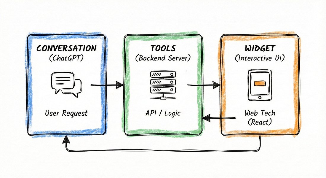 这形成了一个循环:用户对 ChatGPT 说话→ ChatGPT 调用一个工具→控件渲染→用户与控件交互→ChatGPT 调用另一个工具。关键的见解是,ChatGPT 负责协调整个过程。它决定何时调用工具、传递哪些参数以及如何响应用户作。你的应用只是暴露能力并渲染界面。