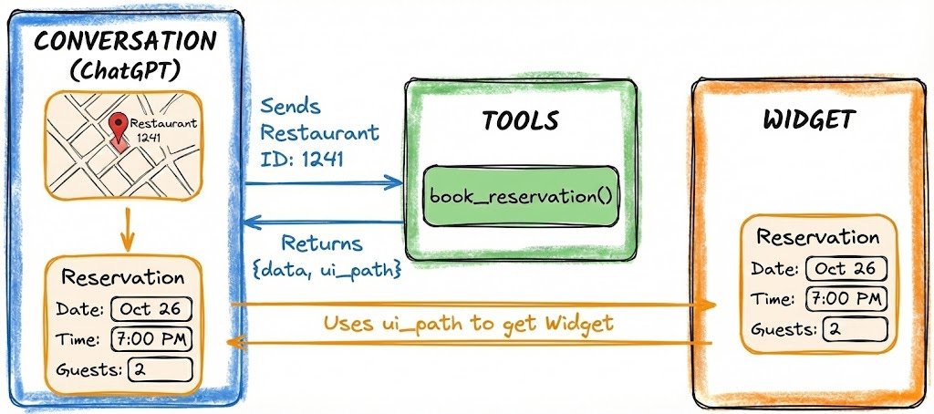 流程是这样的:用户说:“帮我找到布鲁克林的意大利餐厅。”ChatGPT 查看可用的工具,发现一个叫 search_restaurants 的工具,描述类似“按地点和菜系搜索餐厅”,并用 {location:“Brooklyn”, cuisine: “Italian”} 来调用。你的服务器负责搜索,返回结果,并且可以选择添加一个小部件来显示结果。ChatGPT 在与用户的聊天中渲染了该小部件。