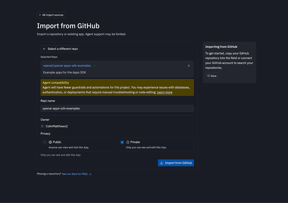 如果你想从头开始,可以访问 Replit,选择“从 GitHub 导入”,然后粘贴这个 URL:https://github.com/openai/openai-apps-sdk-examples