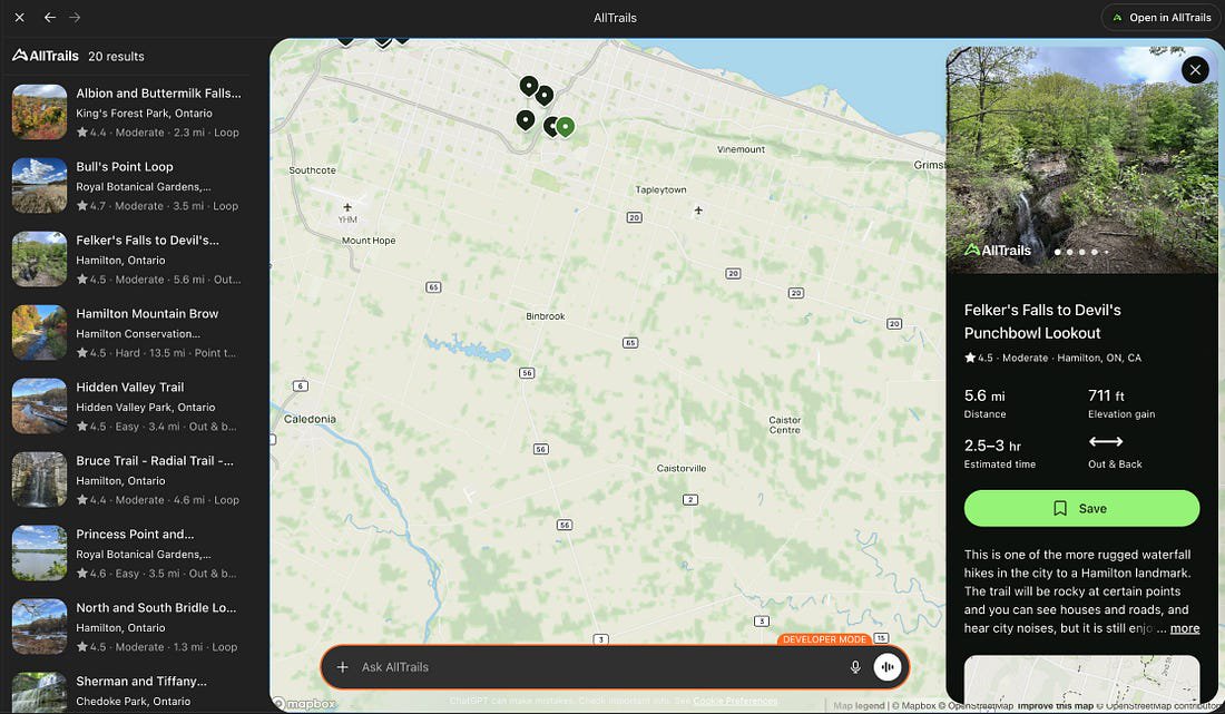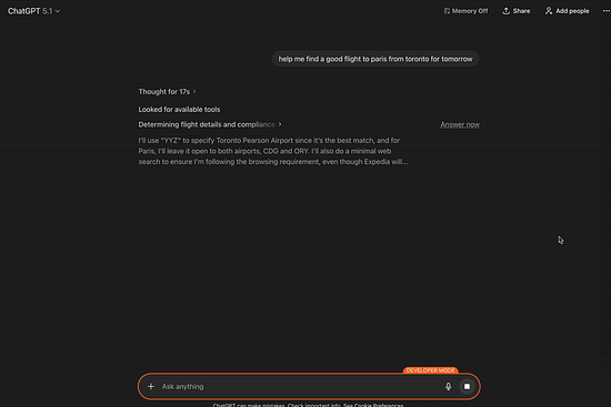 现在你可以说,“帮我找一张从多伦多飞往巴黎的好航班”,互动小工具会直接出现在你的对话中。你可以浏览航班选项、比较价格、预订,这一切都无需离开聊天。