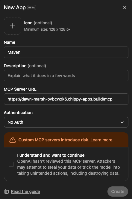 添加名称、MCP 服务器 URL,并将认证设置为无授权。一旦点击“创建”,你就成功制作了你的第一个 ChatGPT 应用!