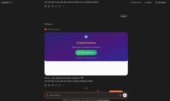 ChatGPT 应用不必像展示视频或展示卡片那么简单。你可以直接在 ChatGPT 中构建完整且复杂的应用。这里有一个我用 Chippy 快速制作的地下城探险游戏示例。你可以看到 ChatGPT 掌握了我当前等级的背景信息,还能给我提升分数的建议。