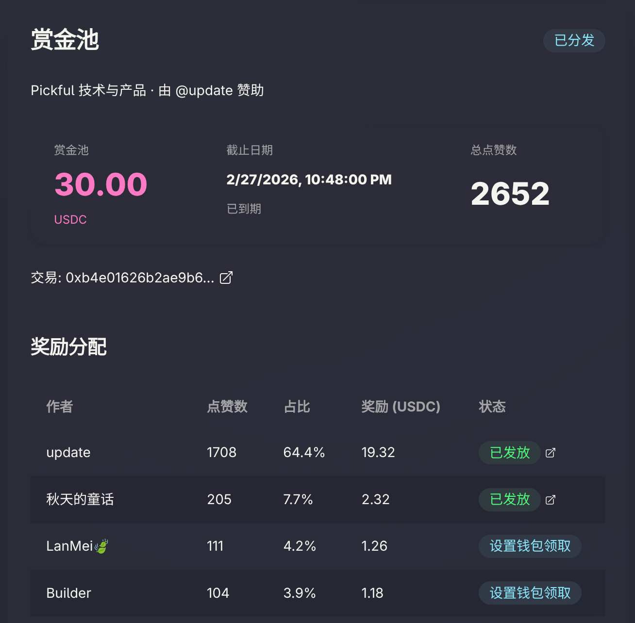 • 历史奖励:所有已结算的赏金记录,包含链上交易链接